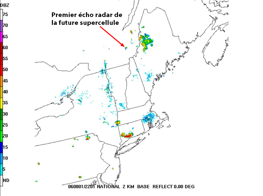 Donc, vers 18h, le premier écho radar de l’orage qui allait donner la tornade était capté. La tornade a pris naissance environ vers 19h. Voici la représentation radar de l’évènement.
