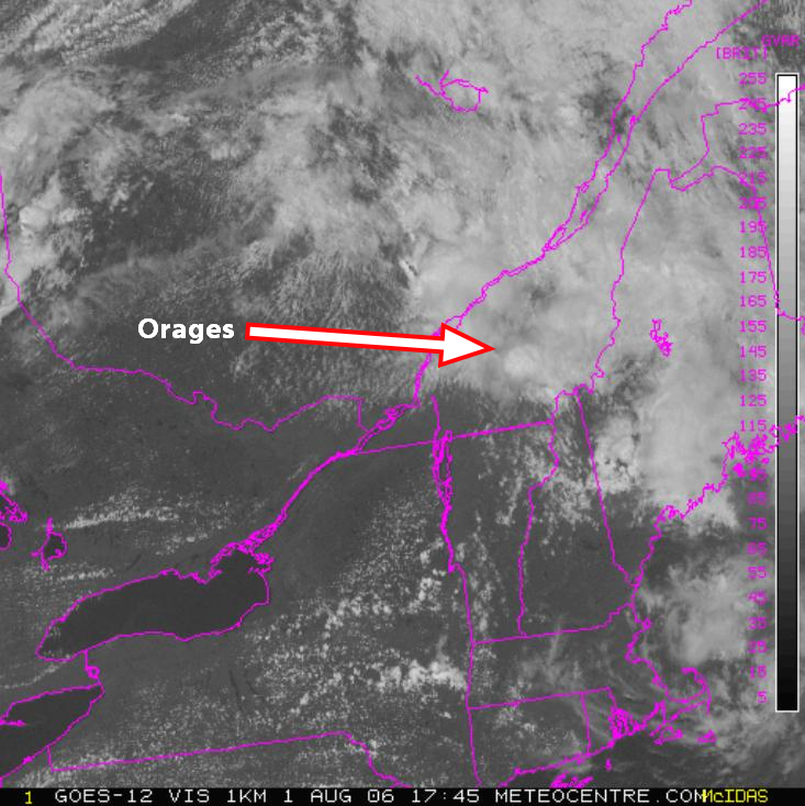 Le front froid qui allait entrer par l’ouest du Québec dans la journée allait très certainement donner naissance à des orages violents. Par contre, la région de l’Estrie était loin de ce front et manquait a priori de soulèvement. Il y avait cependant peut-être un petit creux dans cette région car des orages s’étaient déjà formés dans la matinée et tôt en après-midi.