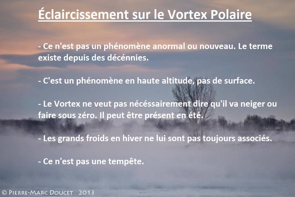 Le vortex polaire est quasiment toujours présent durant l’année avec plus ou moins de vigueur. Il est relié à la force du courant-jet, plus celui-ci est fort, plus les vents resteront dans une direction ouest-est et plus le vortex restera sur le pôle nord. C’est un phénomène de haute altitude, donc invisible à l’oeil.
