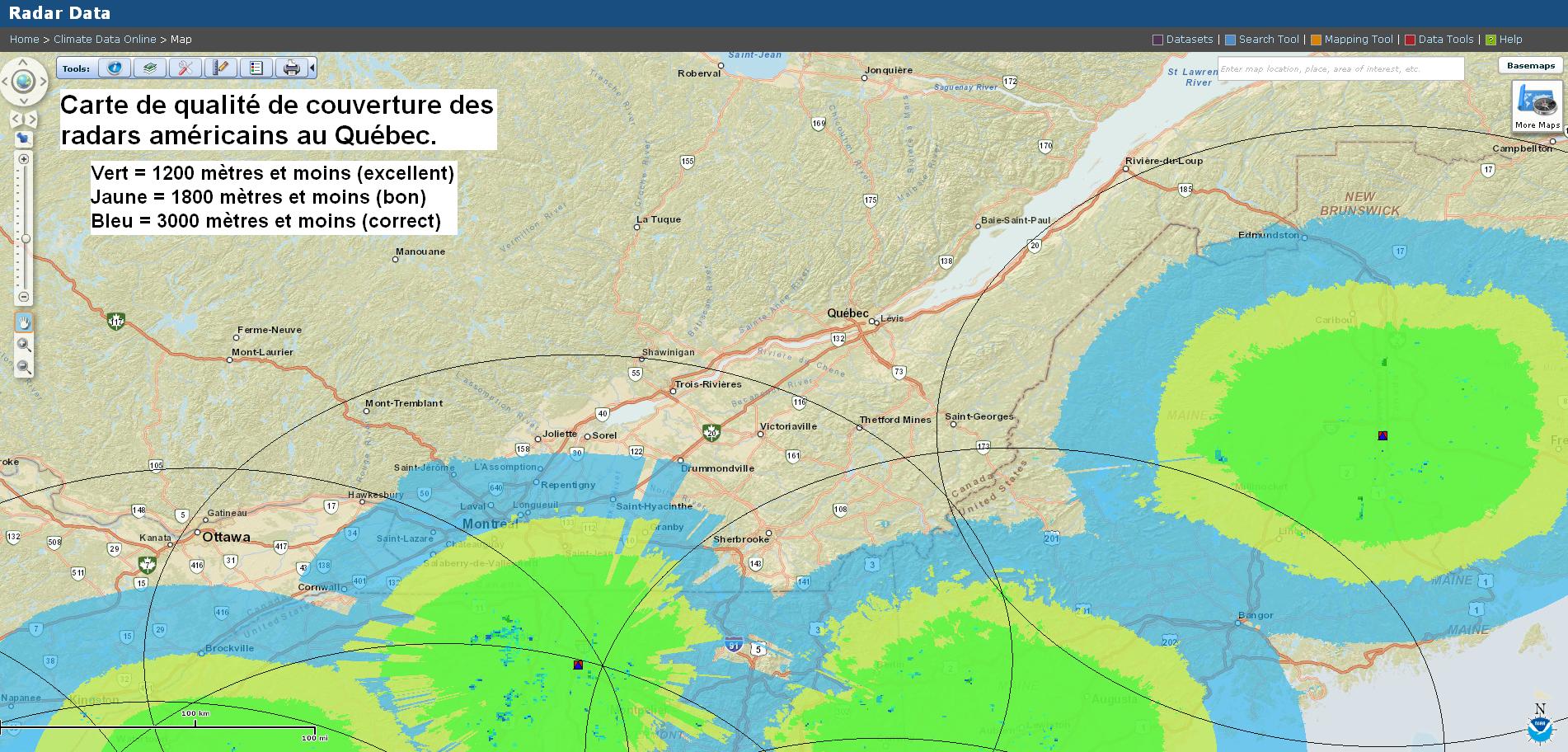 Vous remarquerez aussi sur la première image du haut, qu’il y a parfois des zones ou la couverture du radar arrête brusquement. Vous pouvez le voir notamment près de St-Hyacinthe et Granby sur la carte. Cela est dû à des blocages d’écho, il peut s’agir d’une montagne, un parc d’éoliennes, un immeuble trop proche du radar. Toutes les zones situées derrière l’axe parallèle au radar et la cause du blocage auront des lectures atténuées à cause de cela.