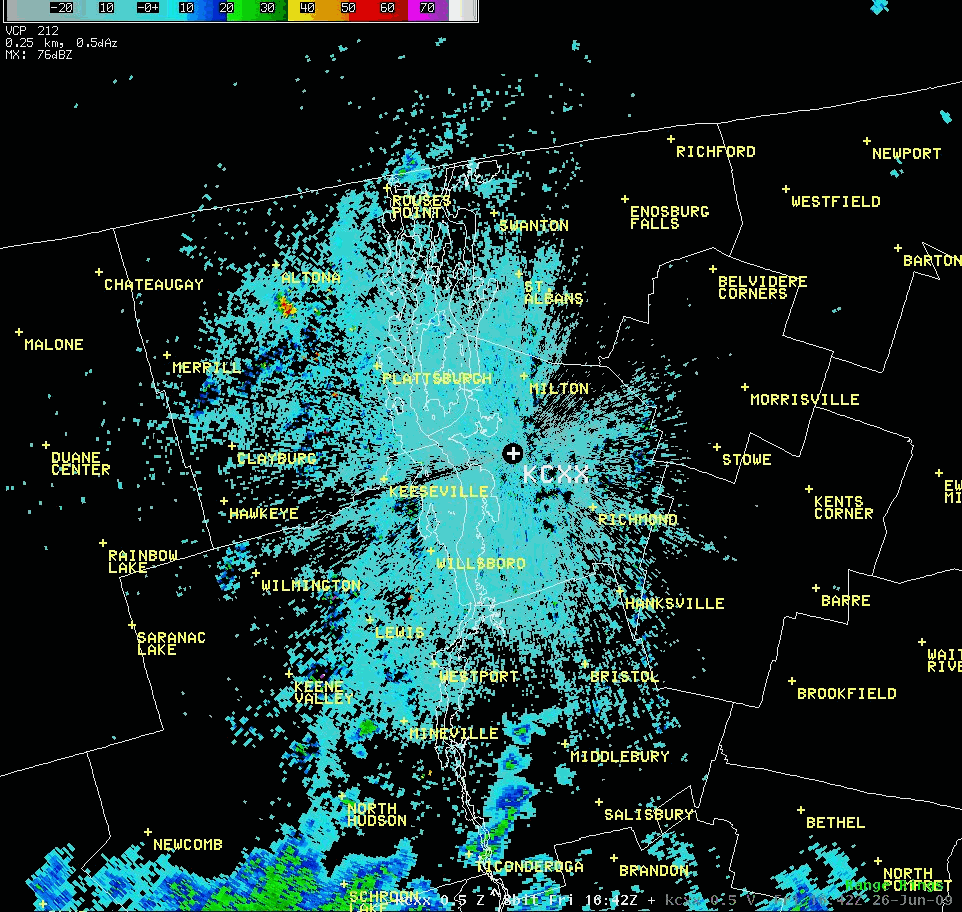 Il existe aussi la possibilité de voir des faux échos à cause de ces obstacles. Voici un autre exemple tiré du radar de Burlington au Vermont.