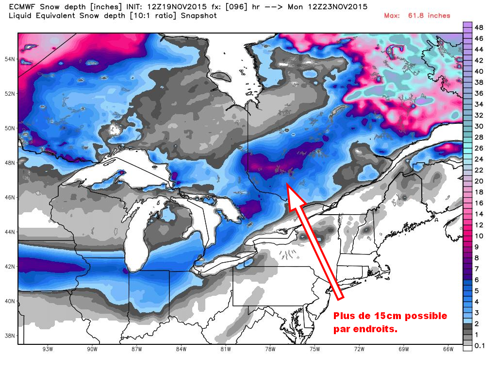Les régions de l’ouest et du centre du Québec (Abitibi-Témiscamingue, la partie nord de l’Outaouais, des Laurentides, et du nord de la Mauricie) pourront voir des accumulations de plus de 15 cm au cours de la fin de semaine (21-22 Novembre), mais particulièrement dimanche. Pour les autres régions montagneuses au nord du fleuve, on parle d’un potentiel de 5 à 10 cm par endroits.