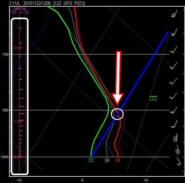 Les zones dans la vallée du St-Laurent montrent pour l’instant un profil de température avec trop de chaleur pour la neige. Voici une coupe verticale prévue de l’atmosphère pour dimanche matin. La ligne rouge montre la température avec l’altitude (long rectangle blanc sur la gauche) et la ligne bleue représente la ligne du 0°C. On voit donc que la ligne rouge et la ligne bleue se coupent un peu plus haut qu’à 1 kilomètre en altitude (encerclées en blanc, pointées par la flèche rouge). Une telle couche de chaleur n’est pas favorable à la neige.