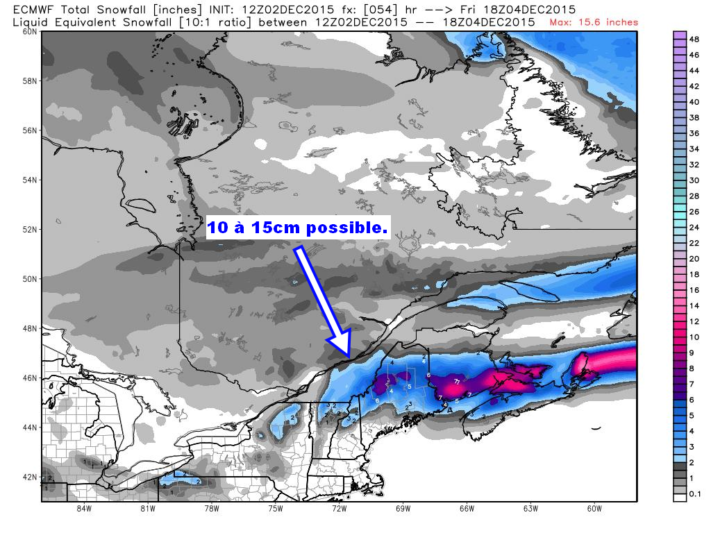 Des accumulations de neige sont possibles pour l’Estrie, la Beauce et une partie du Bas St-Laurent à partir de jeudi après-midi jusqu’à vendredi.
