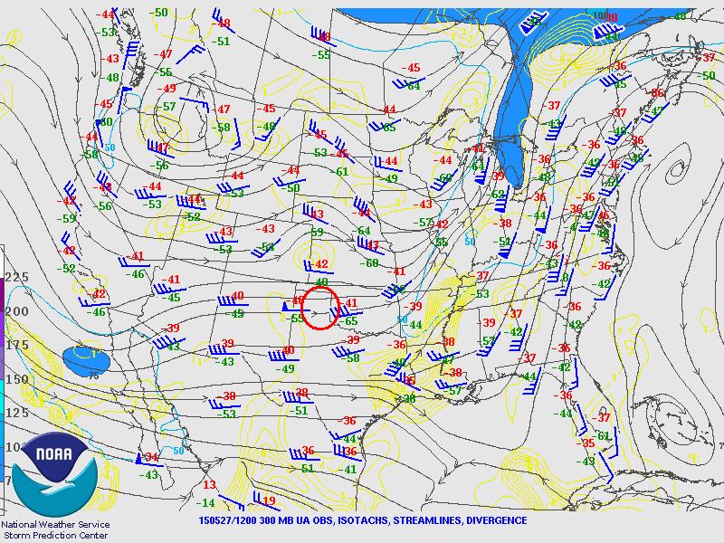 Tout d’abord, en regardant le courant-jet, celui-ci était correct tout au plus. On pouvait déjà voir cependant qu’il était un peu plus fort sur le Texas Panhandle. De plus, comme on le verra plus loin, il était bien aligné pour que les enclumes des orages à naître n’interagissent pas trop ensemble.