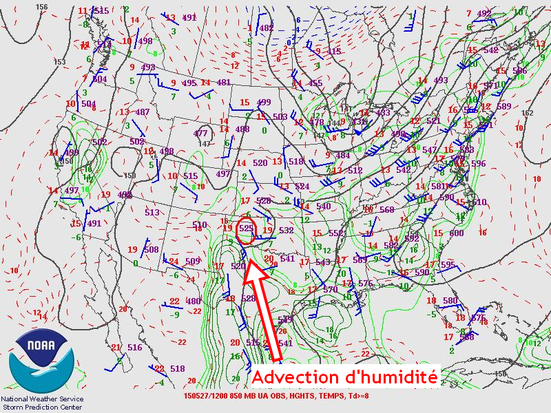 Un autre point d’intérêt était que la qualité de la couche d’humidité présente dans les basses couches de l’atmosphère allait en s’améliorant. Il y avait une bonne advection d’humidité du Golfe du Mexique qui arrivait sur ces régions avec le courant-jet de bas niveau. Le scénario pour que beaucoup d’instabilité soit présente sur ces régions plus tard en journée commençait à se préciser.