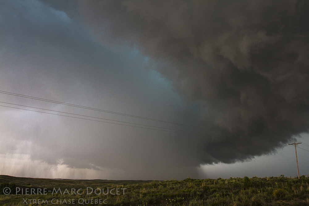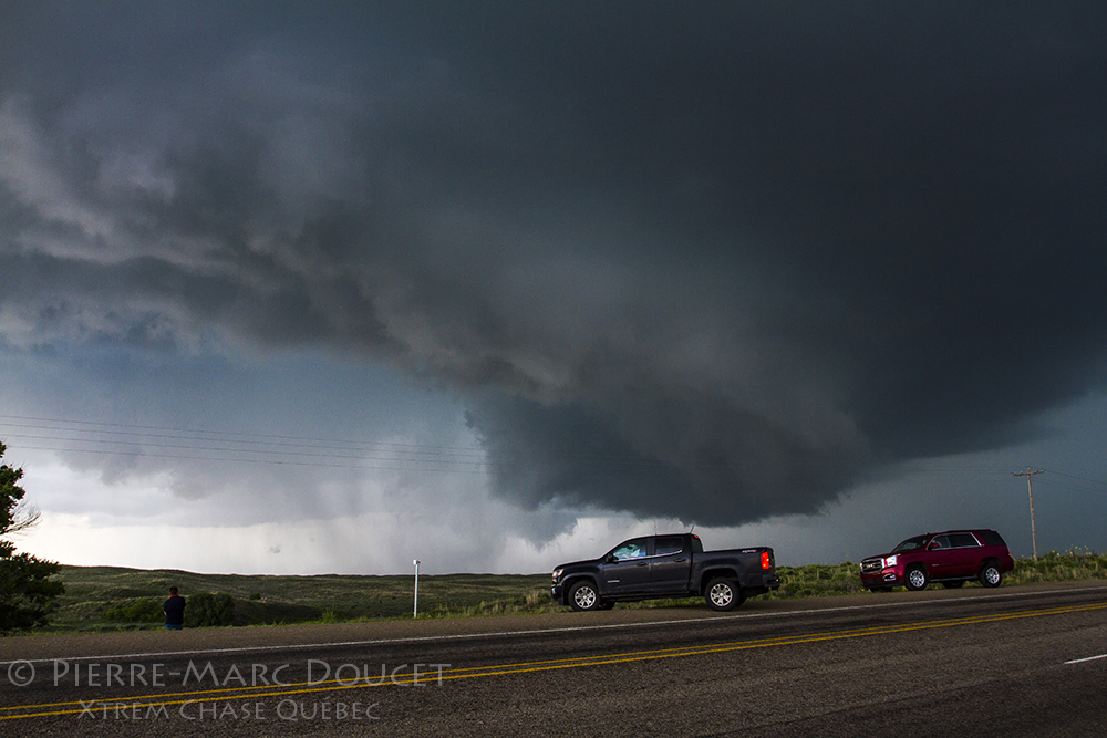 Nous avons eu droit à une autre brève tornade un peu plus tard en soirée. Mais nous avions la vue de sa base caché par une colline et elle s’est rapidement enveloppée dans la pluie. Ce sont d’autres chasseurs qui nous ont confirmé plus tard que c’était bel et bien une tornade.