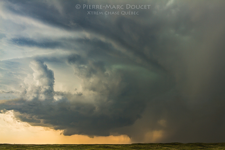 L’orage était pratiquement stationnaire et d’autres petits orages se formaient tout près. Ils venaient souvent s’amalgamer dans la plus grosse supercellule. Il est probable qu’il y avait une sorte de phénomène à plus petite échelle dans le coin comme une « outflow boundary » laissé par les orages de la veille ou encore le terrain plus accidenté dans ce coin favorisant les courants ascendants. Ces orages étaient un peu fatigants car ils coupaient probablement le potentiel tornadique avec les précipitations qui tombaient souvent dans le RFD de la supercellule principale.
