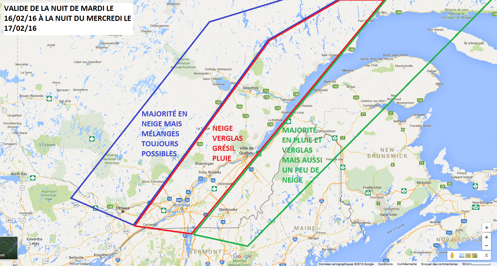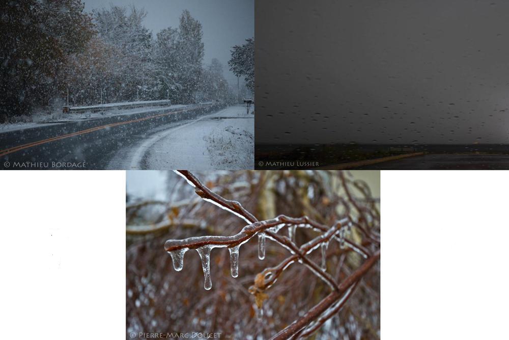 Tout d’abord, dans la zone bleue, la majorité des précipitations sera en neige. Certains endroits iront chercher plus de 30cm. Le risque de verglas est aussi présent au courant de la journée de demain. Particulièrement sur les régions de l’Outaouais et des hautes Laurentides.