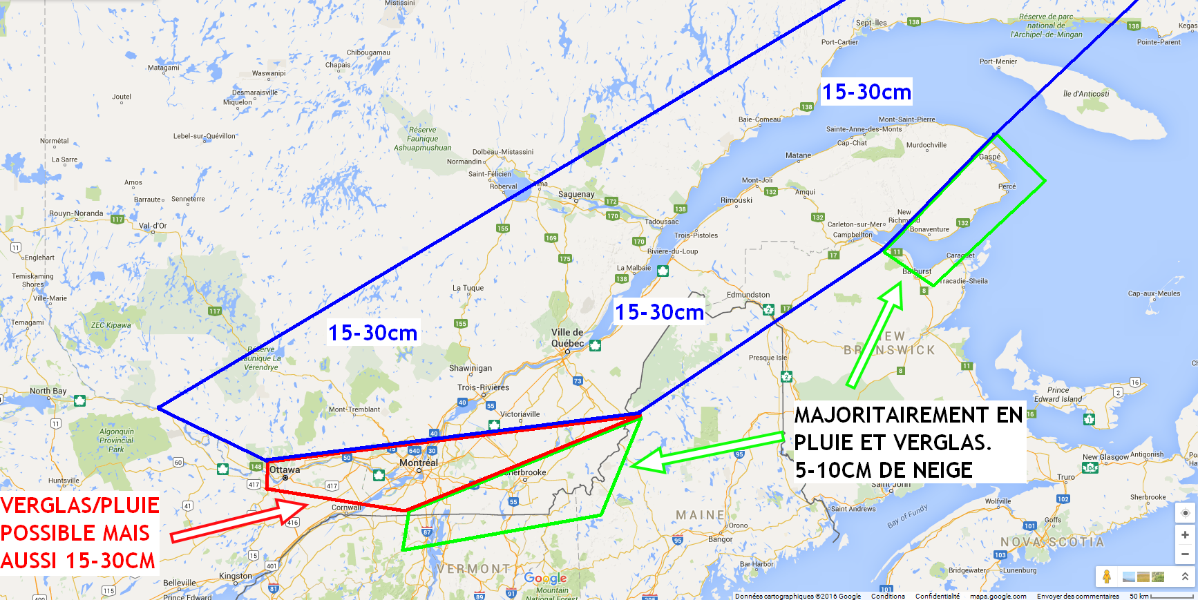 Avec lui, des bonnes quantités de neige, mais aussi encore du verglas et de la pluie sur certaines régions. Il y aura de l’advection d’air chaud devant cette dépression et les régions de l’extrême-sud de la province devraient en ressentir les conséquences. Reste à voir jusqu’où cet air chaud remontra mais sur la carte qui suit, cela devrait donner une bonne approximation des risques. Cliquer sur la carte pour une version plus grande.