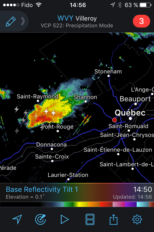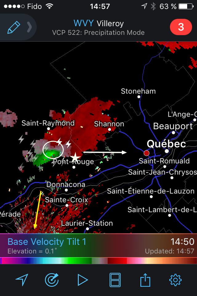 La position du radar est très importante dans la lecture de la vélocité d’un orage. Cela peut nous dire si nous avons affaire à des rotations ou d’autres types de vent. Je vous conseille de faire la lecture de cet article aussi pour un peu mieux comprendre: COMMENT DÉTECTER LA ROTATION AU RADAR DANS UN ORAGE