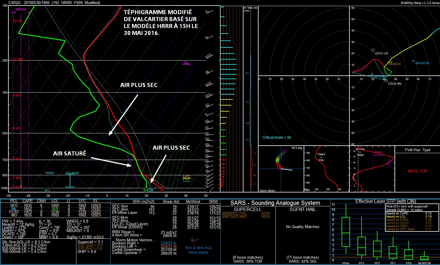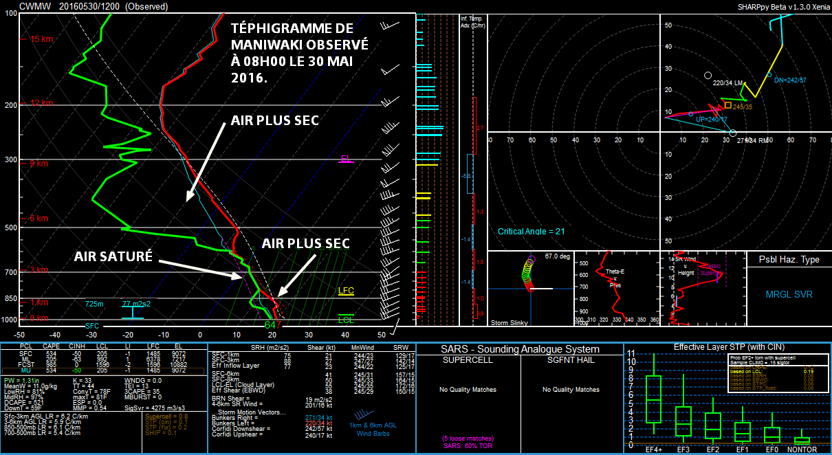 L’air étant en mouvance, il était possible que de telles conditions se retrouve un peu plus loin sur le centre du Québec dans la journée. Voici maintenant une autre coupe verticale de l’atmosphère, cette fois dans le coin de Québec. J’ai modifié un peu l’environnement avec les données disponibles des observations au plus près d’où l’orage était situé juste un peu avant celui-ci.