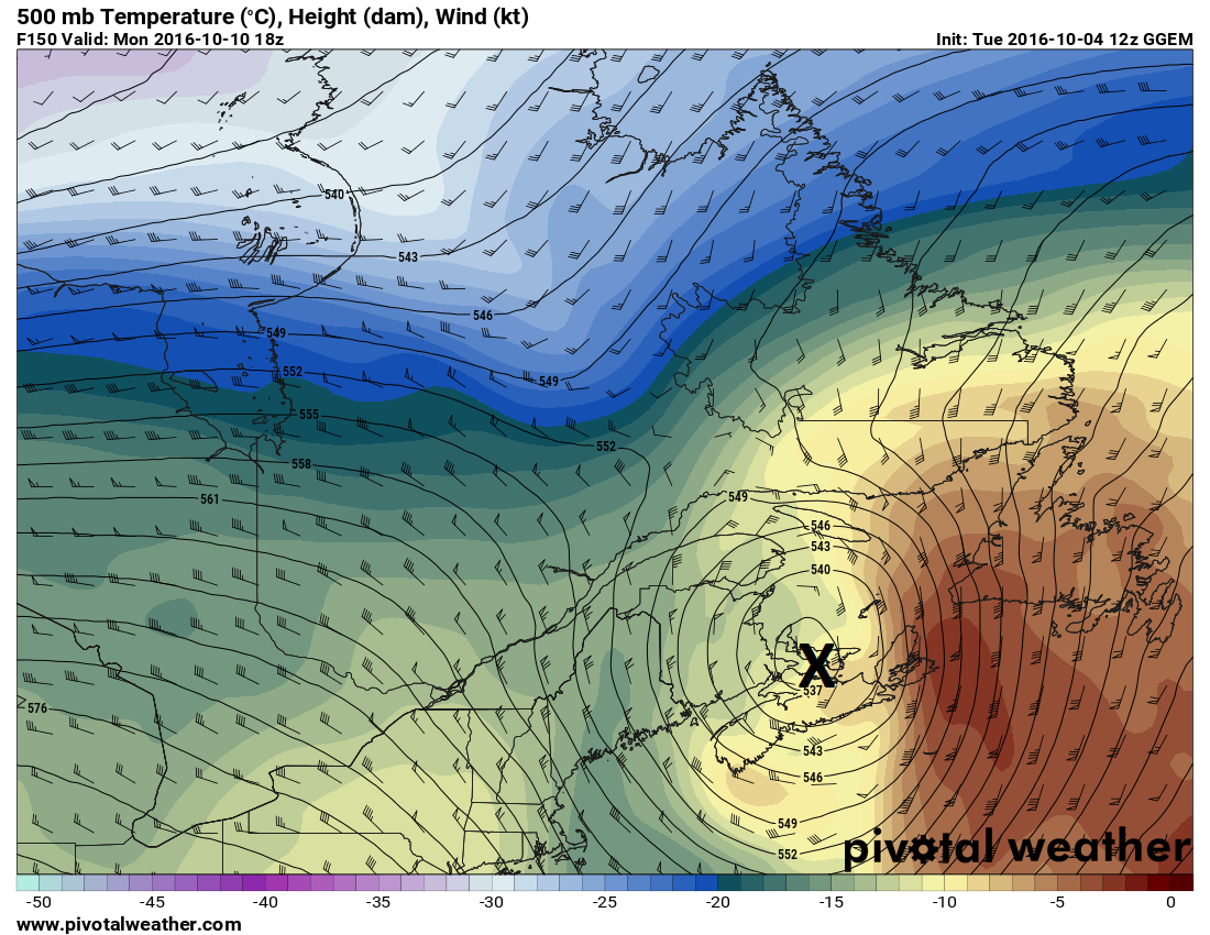 « Coeur » plus froid et en transition lors de son passage prévu sur les maritimes. Le « X » est le centre dépressionnaire. On remarque que l’air chaud se décale vers la droite et l’air froid envahit la partie gauche et le centre. Un pattern similaire aux systèmes frontaux (front froid/front chaud) s’installe alors qu’il est absent avec l’ouragan.