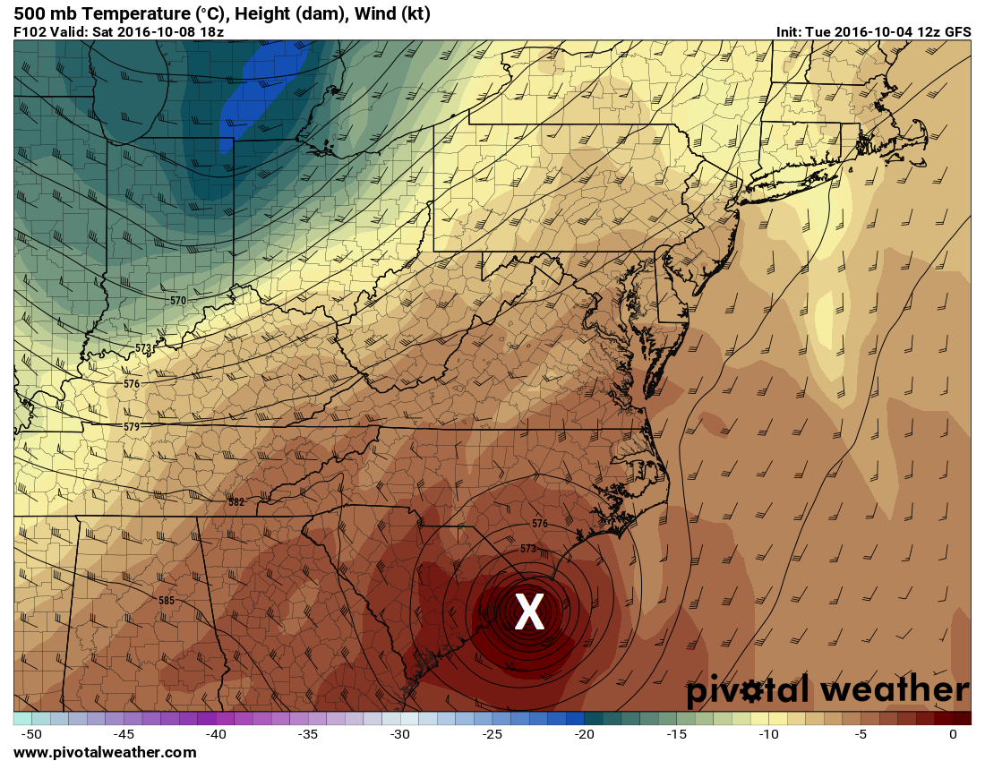 « Coeur » chaud de Matthew prévu près des Carolines. Le « X » représente le centre de l’ouragan. On remarque les couleurs de plus en plus chaudes près du centre.
