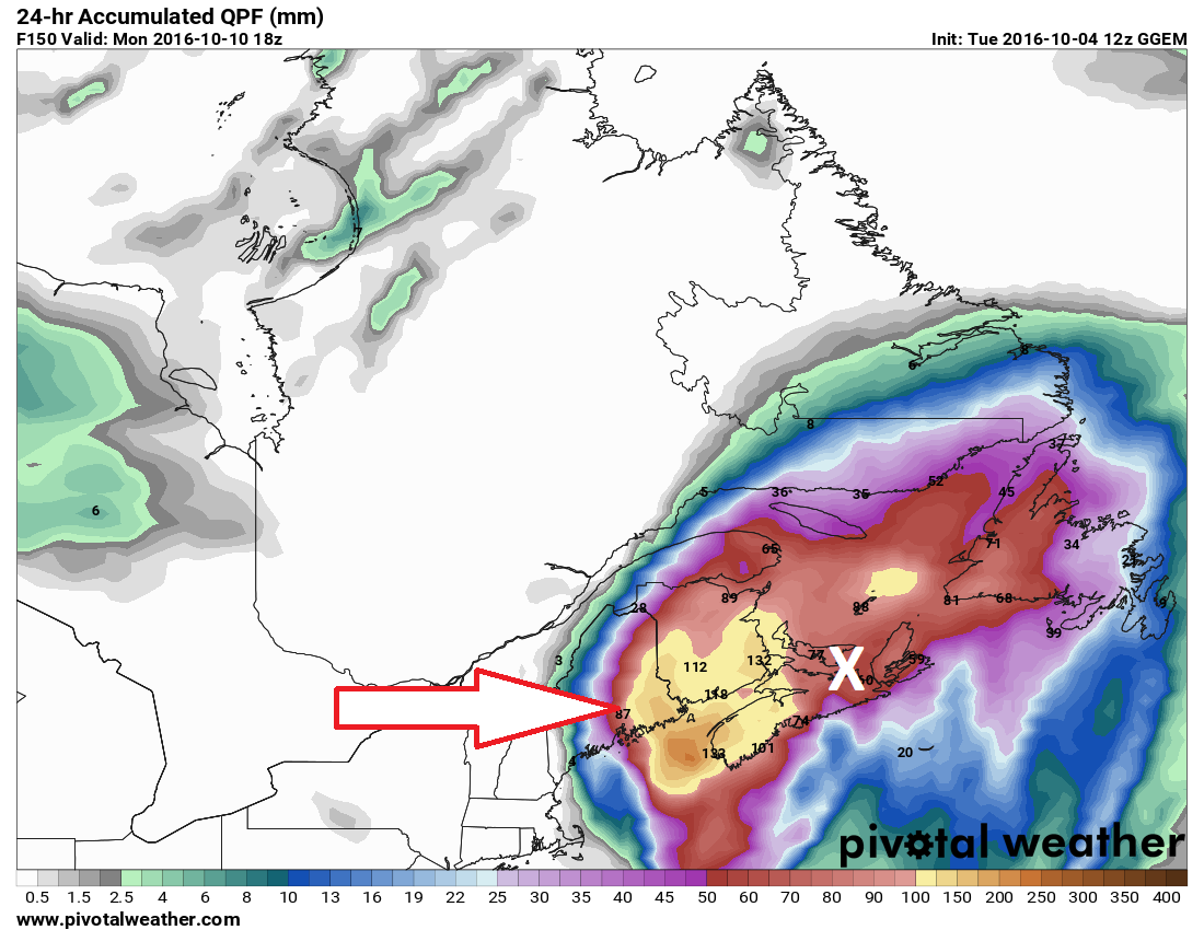 Précipitation prévue sur 24h lors du passage de Matthew. Le « X » est le centre dépressionnaire. On voit que le gros des précipitations se situe à gauche du centre.