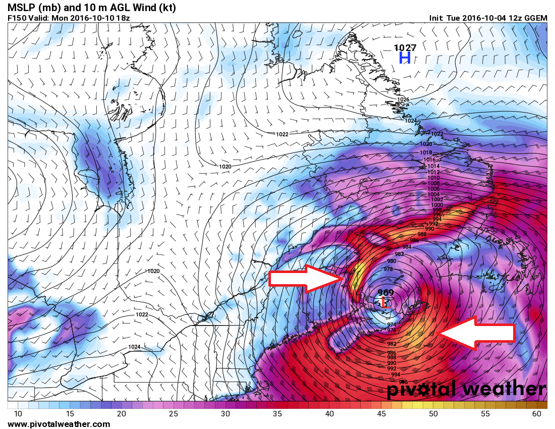 Lors d’un ouragan, les vents les plus forts seront concentrés près de l’oeil. On appelle cette région le mur de l’oeil ( plus d’infos ici ). Dans un système post-tropical les vents les plus forts en surface seront beaucoup plus éloignés du centre.