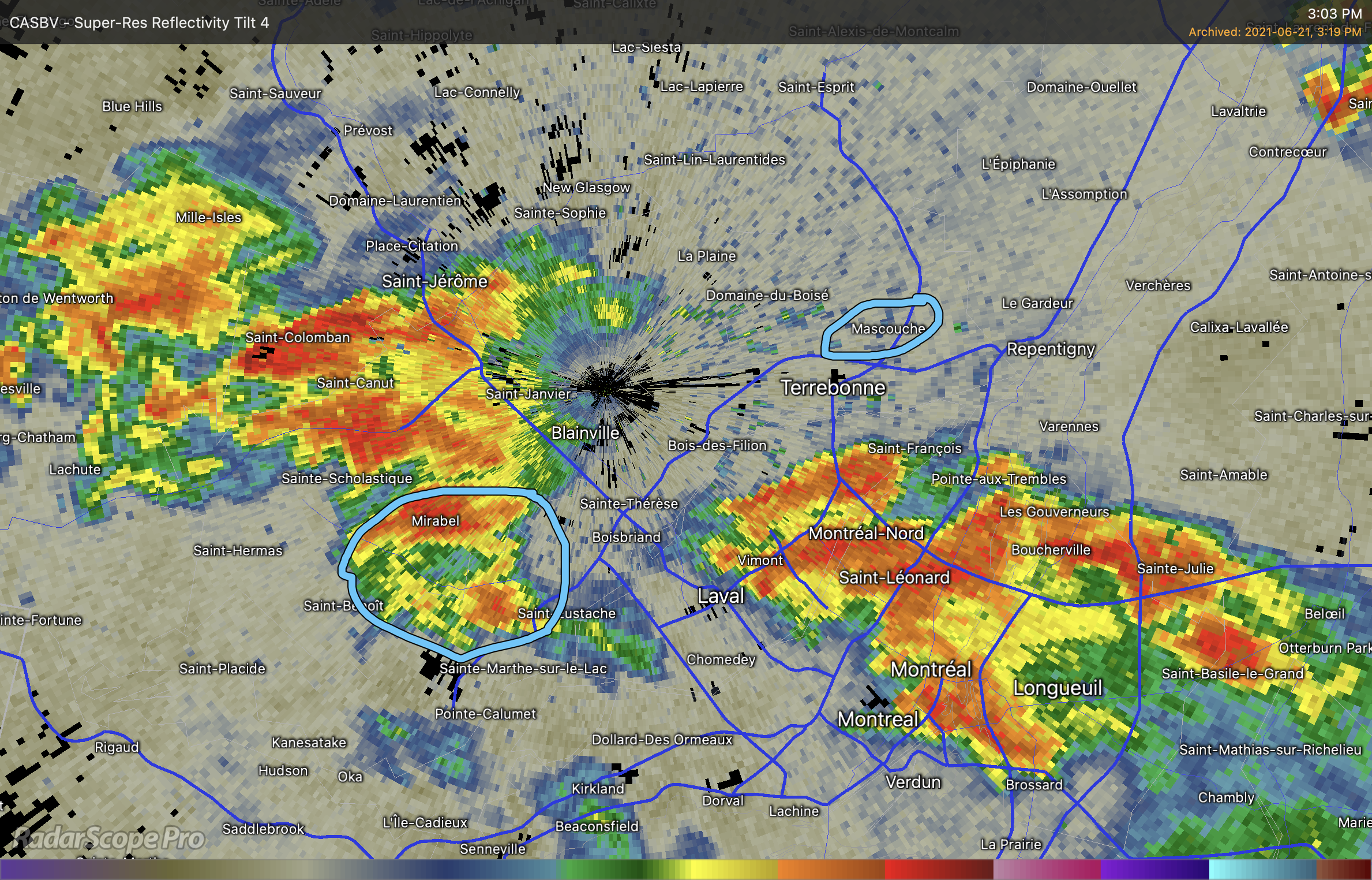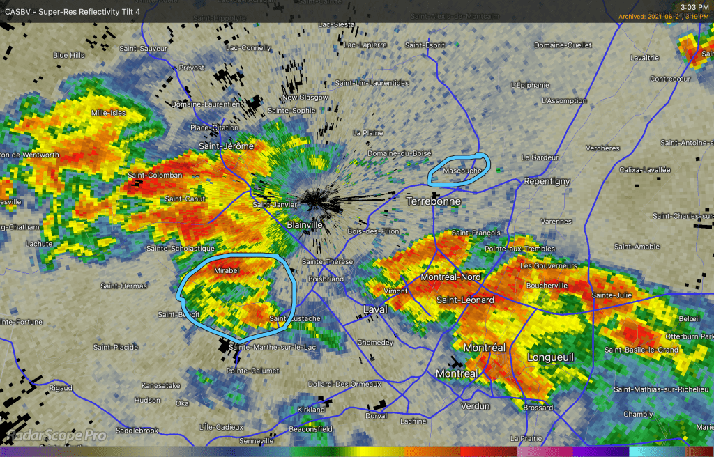 La cellule orageuse responsable de la tornade de Mascouche a pris naissance vers 15h près de Mirabel. Environ une trentaine de kilomètres au sud-ouest de Mascouche.