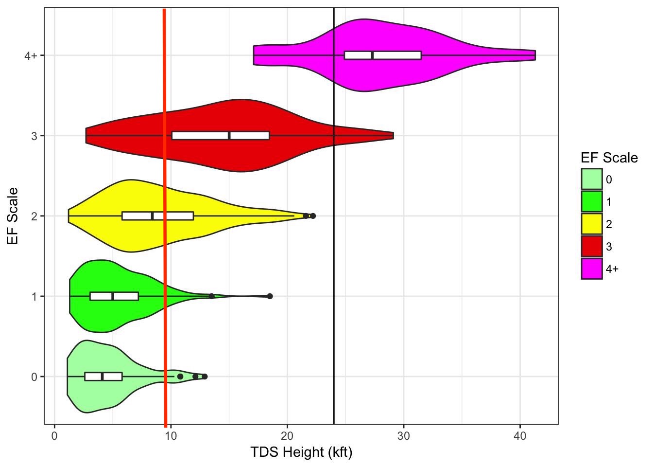 En regardant les donnés de l’image suivante, on peut voir qu’une telle hauteur de débris peut correspondre à une forte tornade (EF2 et plus) car la ligne rouge que j’ai ajoutée correspond dans les percentiles très probables de ce type de tornade.