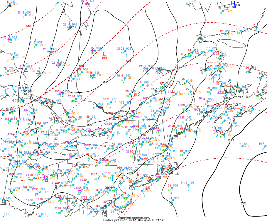 Depuis quelques jours, les modèles météo anticipaient qu’une dépression assez forte pour la saison allait toucher la province pour le 21. En après-midi, on pouvait voir le centre de la dépression située en Abitibi. La pression était de 989 millibars et continuait de descendre. Lors de l’analyse atmosphérique du matin, on pouvait aussi voir un bon creux en altitude, centré sur la baie d’Hudson, mais son influence se faisait sentir jusque sur le mid-ouest Américain. L’axe du creux commençait à virer en « negative tilt », un indice que nous avons à faire à un système qui va en se renforçant.