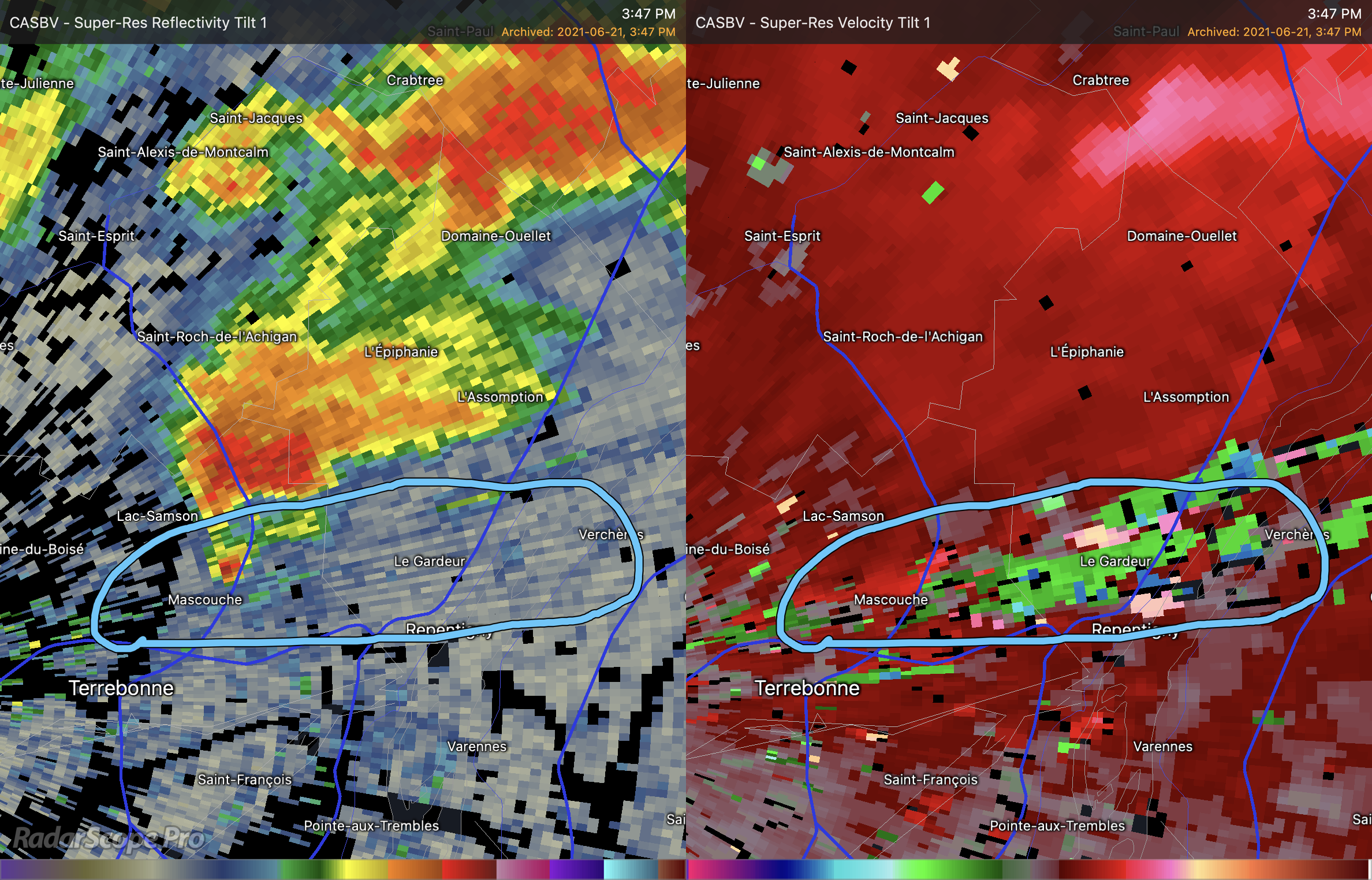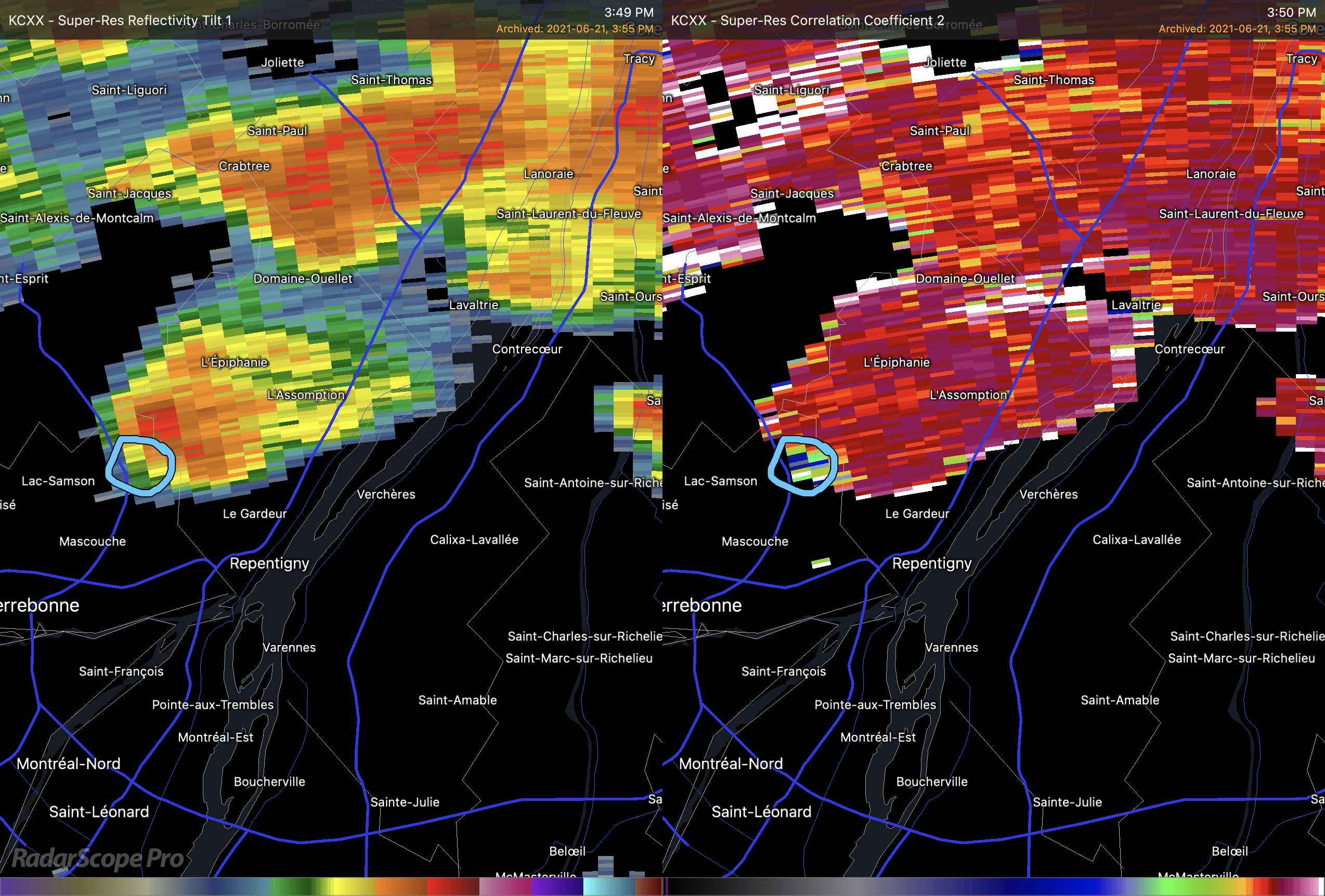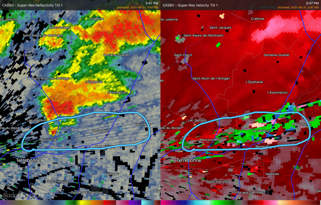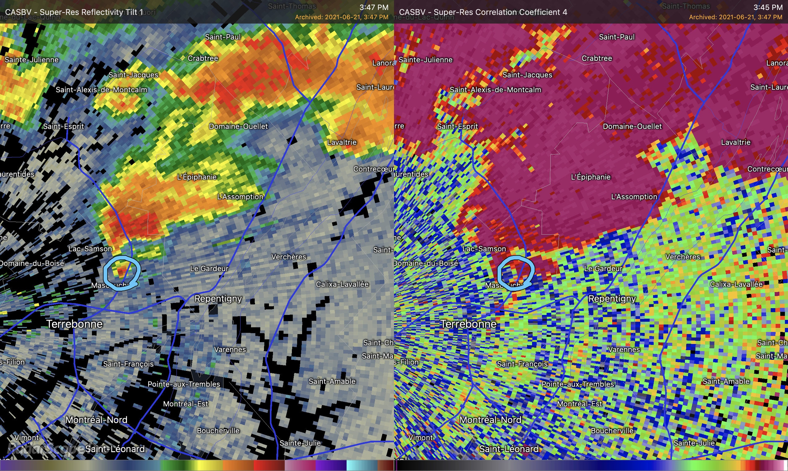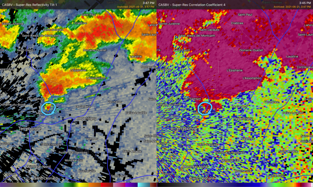L’atmosphère ce jour la était explosive pour ce genre de développement rapide. La tornade a commencé à prendre naissance peu de temps après et on a pu voir un « débris ball » visible sur l’imagerie radar à 15h45. Sur l’image de droite, il s’agit toujours de la représentation des précipitations. J’ai entouré en bleu l’endroit ou le débris ball était visible. Sur cette image, le radar interprète les débris comme des précipitations très fortes au bout du crochet. Sur l’image de droite, il s’agit du coefficient de corrélation. Cette mesure permet de voir la dimension et la forme des particules captées par le radar. Lorsque les températures deviennent plus froides, comme le vert et le bleu, cela indique que le radar voit des formes hétérogènes, donc des particules sans la même forme et/ou direction, dans le jargon on parle d’un « CC drop ». Quand un débris ball sur la réflectivité et un « CC drop » sur le coefficient de corrélation sont vis-à-vis sur superposé comme ici, il y a de très fortes raisons de croire qu’une tornade est en cours.