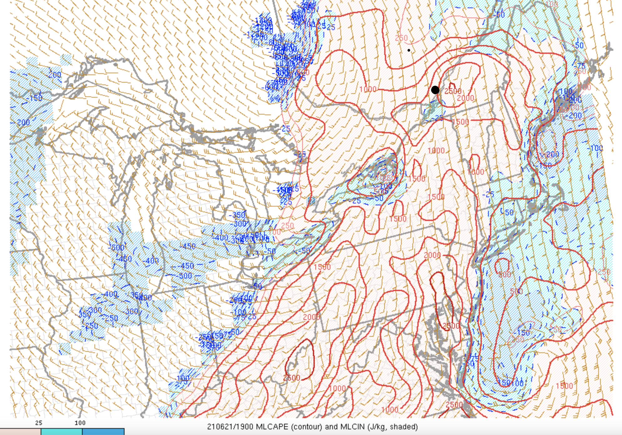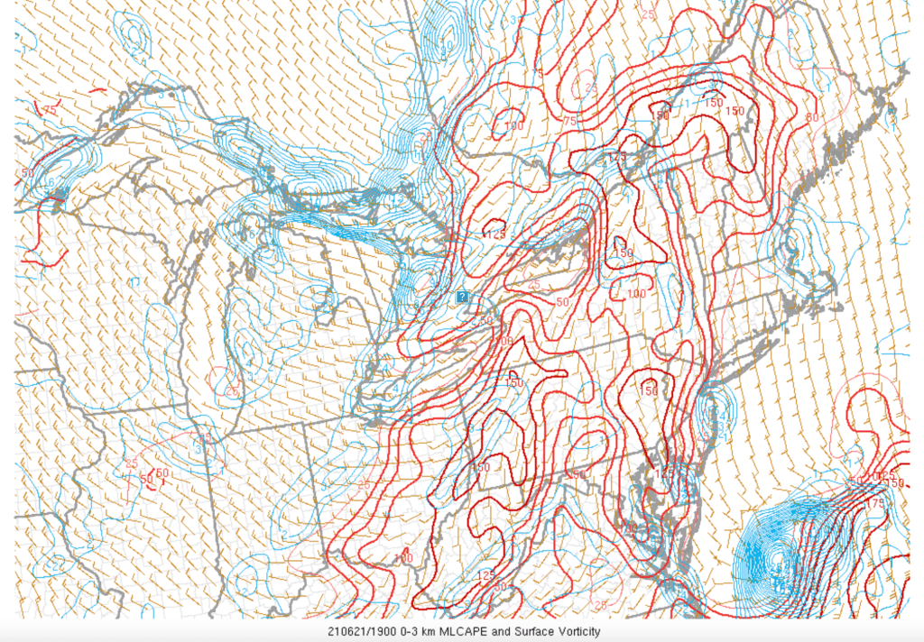 À noter aussi qu’une quantité importante de l’énergie disponible dans l’atmosphère ce jour la était emmagasinée dans les 3 premiers kilomètres de l’atmosphère. Le 0-3 kilomètre CAPE est un indice important permettant de voir la force des courants ascendants. Des courants ascendants puissants sont un ingrédient important dans la formation des orages violents mais aussi des tornades. Sur le sud du Québec ce jour-là, il semble que des valeurs entre 100 et 150 j/kg étaient présentes. Des valeurs à partir de 50 j/kg sont considérés intéressantes pour la formation des orages violents/tornades.
