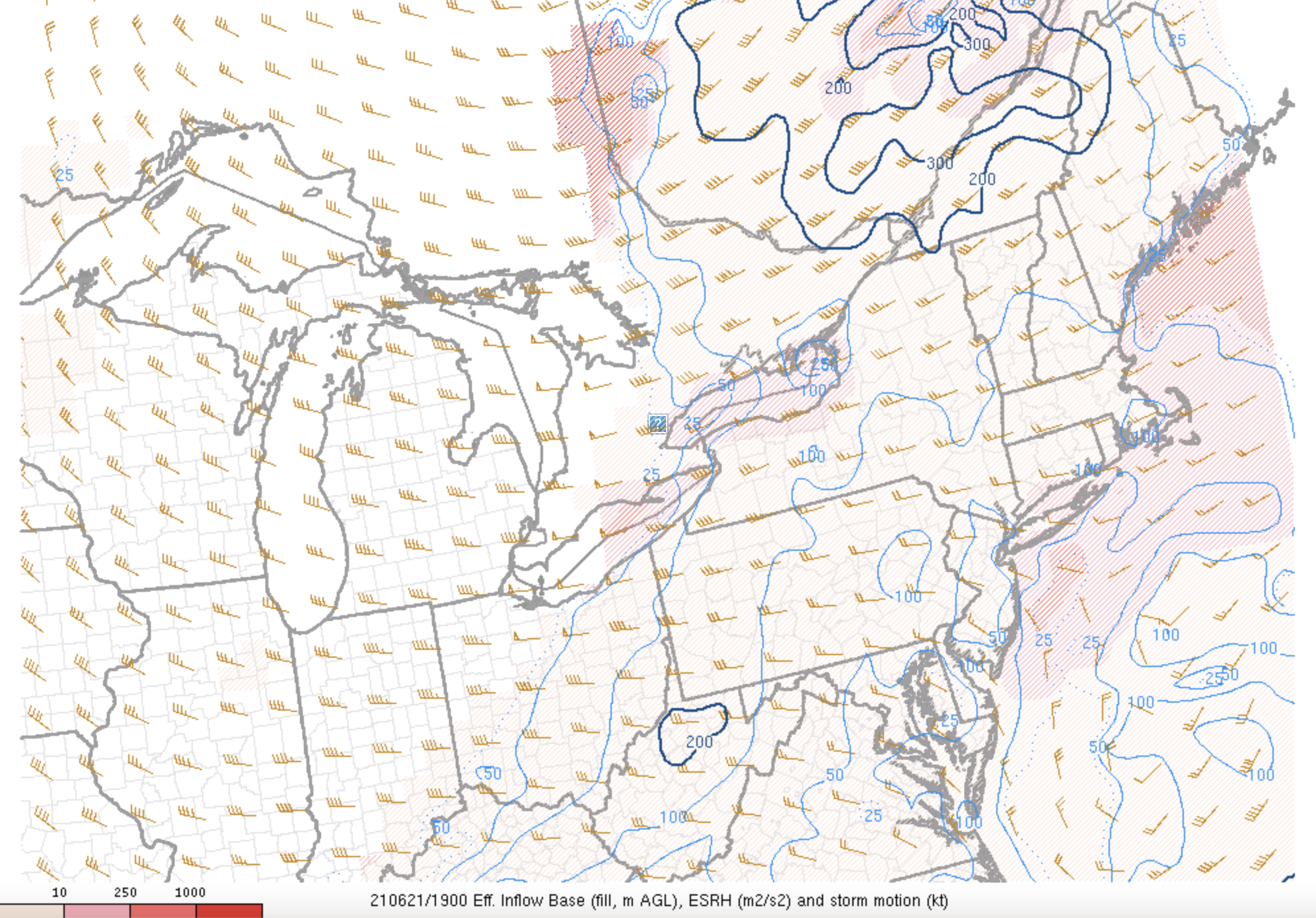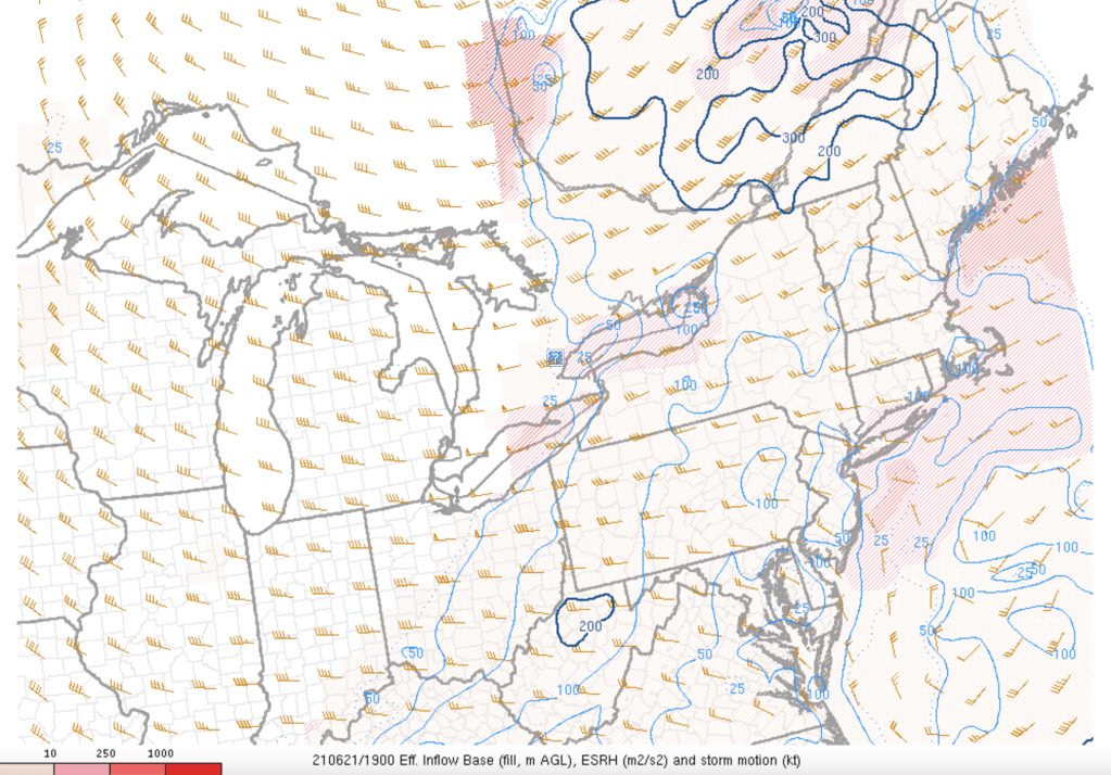 Comme je le mentionnais plus tôt, les fronts chauds apportent une grande quantité d’hélicité avec eux. Sur la prochaine carte, la quantité d’hélicité représentée est celle pouvant être ingérée dans l’influx entrant qui nourrit l’orage. Des valeurs entre 200 et 300 m2/s2 étaient présentes sur le sud de la province. Ce genre de valeur peut être associé à des fortes tornades (EF2 et plus).