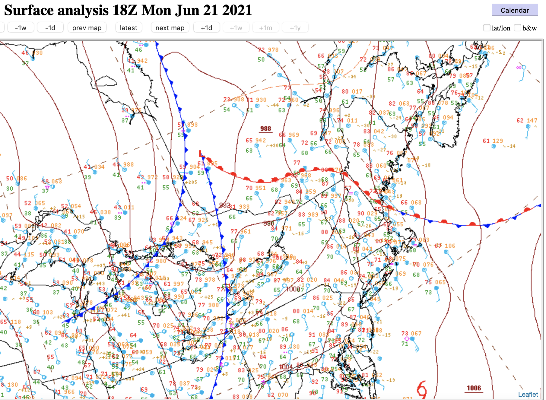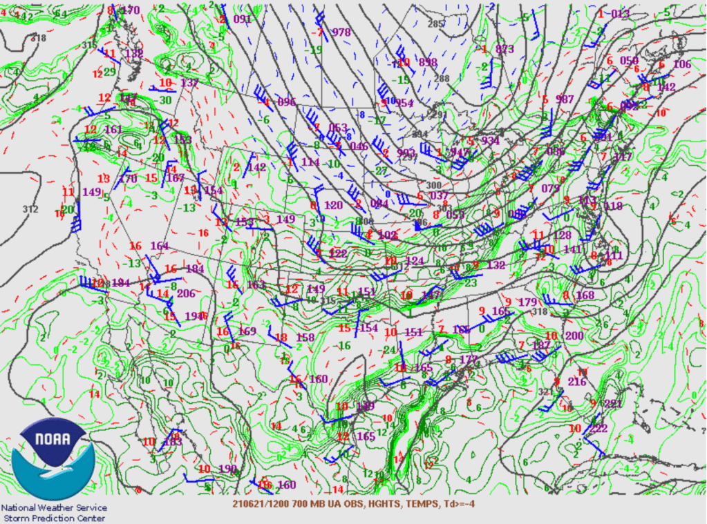 La masse d’air était aussi bien humide, même plus haute en atmosphère, ce qui donnait déjà un indice que l’humidité ne serait un problème lors de cette journée. Sur la carte suivante, le Québec est dans le coin en haut à droite.