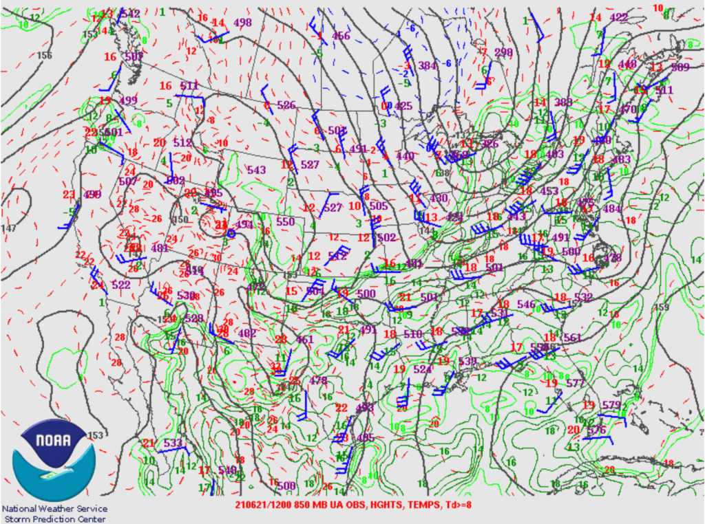 Carte de 850mb montrant une bonne advection d’humidité le matin (lignes vertes)