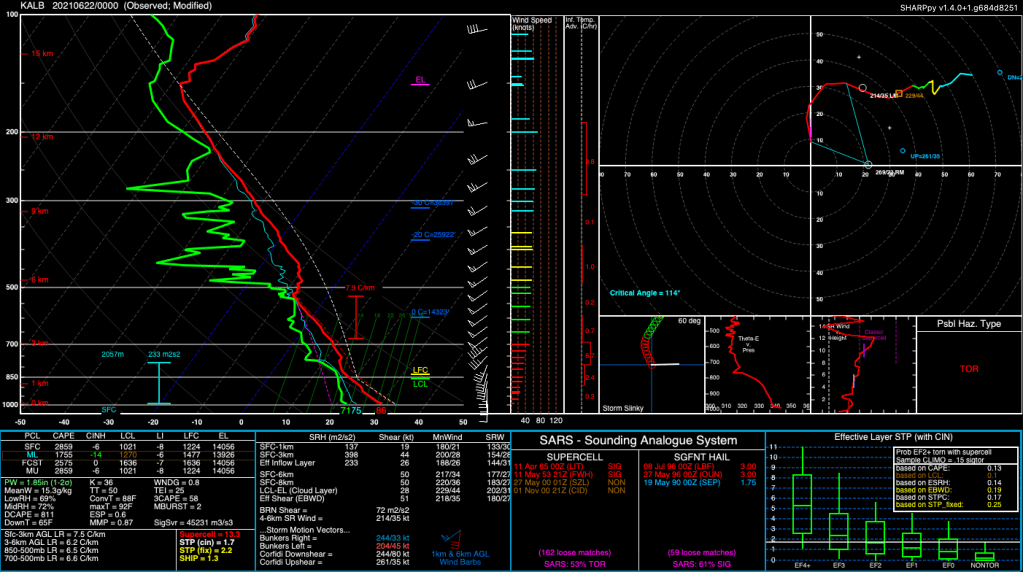 Voici un skew-t, représentation de l’atmosphère avec l’altitude, que j’ai modifiée pour représenter davantage la situation près de Mascouche peu avant la tornade. J’ai surtout modifié la partie de l’hodographe (dans le coin en haut à droite) pour représenter plus les conditions du cisaillement ici. Le skew-t de base est celui qui a été observé à 20h ce soir à Albany dans l’état de New York un peu au sud de nous. À 15h, la station de l’Assomption dans le sud du Québec rapportait 86F/71F (30 Celsius pour la température de l’air sur 22 Celsius pour la température du point de rosée. La même que celle d’Albany le soir, le profil thermodynamique était donc probablement assez semblable. Un autre indice à surveiller est aussi le DCAPE ou Downdraft CAPE. Cet indice donne la quantité d’énergie disponible pour les courants descendants. Pour cette journée-là, le sud du Québec était aux alentours de 800 j/kg. Ce qui est assez fort mais pas trop non plus. Une chose aussi importante pour la formation des tornades car des courants descendants trop puissants amène de l’air plus froid ce qui débalance l’équilibre fragile des ingrédients requis. Généralement, des valeurs de DCAPE au-dessus de 1000 j/kg ne favorisent pas la formation de tornades, mais de micro-rafales oui.