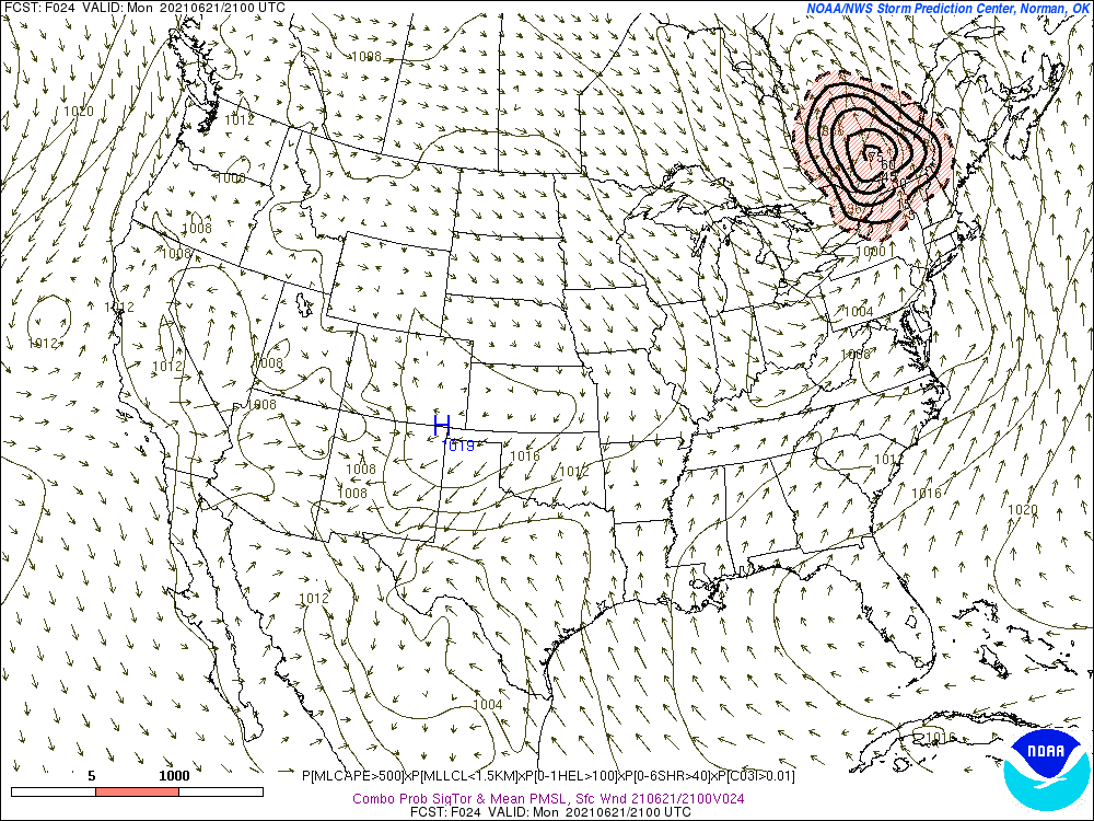 Les modèles météo montraient aussi depuis quelques temps un potentiel important au niveau des orages mais aussi des tornades ce jour-là La carte qui suit est une carte qui montre les chances de tornades selon plusieurs paramètres, comme l’énergie, les précipitations, le cisaillement ainsi que la hauteur de la base des nuages. On peut voir que les indices étaient très importants au dessus du Québec.