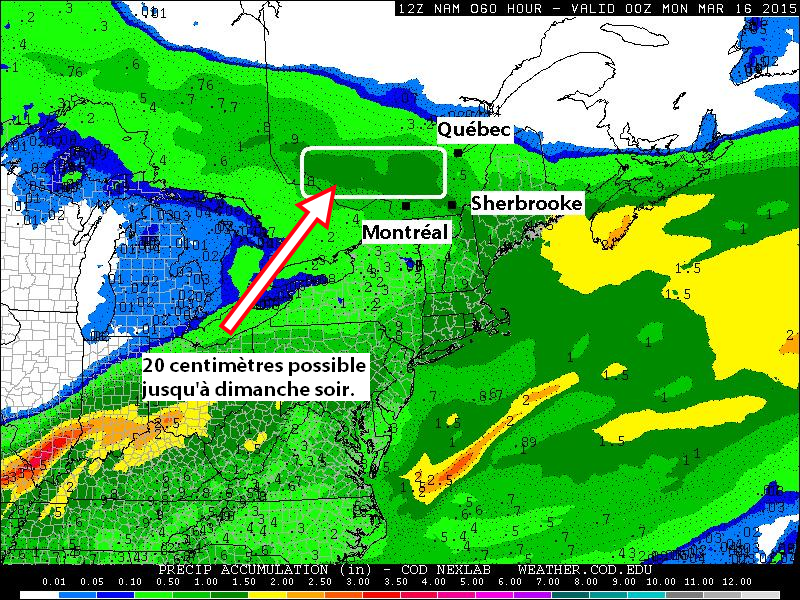 Carte du tourbillon pouvant être ingéré dans le courant ascendant. (Entre 100 et 150 m2/s2 pour le sud du Québec.